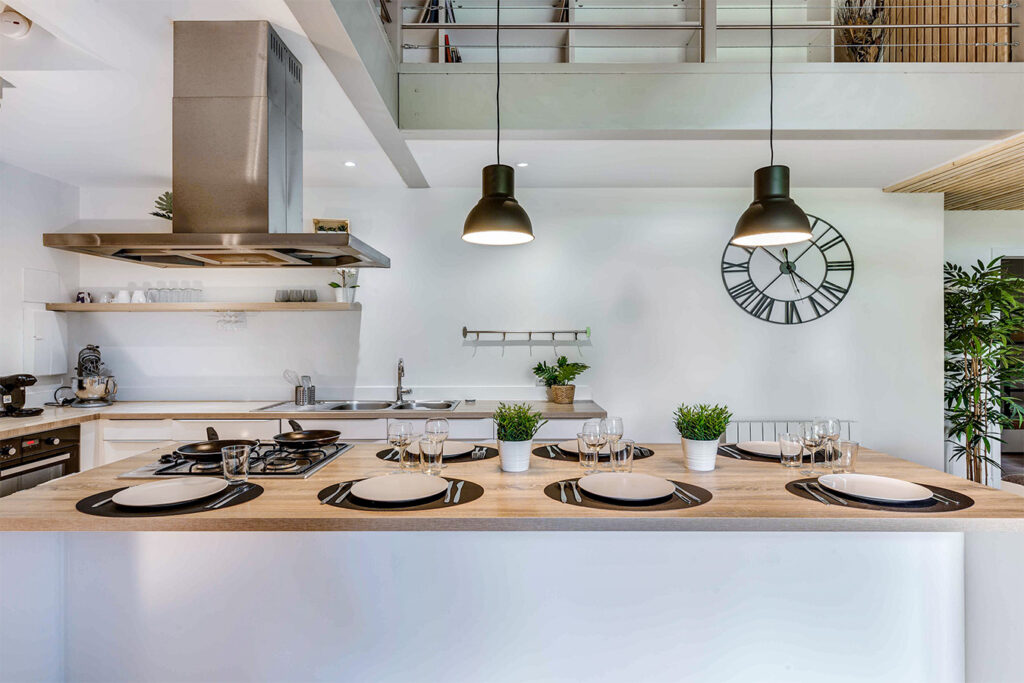 Découvrez cette magnifique cuisine moderne, zen et nature, conçue pour les passionnés de cuisine. Son îlot central est le coeur de la pièce, parfait pour préparer des repas tout en partageant des moments conviviaux. Elle est équipée d'un four, d'un micro-ondes, d'un lave-vaisselle et d'un frigo, sans oublier tous les ustensiles nécessaires. Dans cette cuisine, la préparation des repas devient un pur plaisir. Vous adorerez y passer du temps!