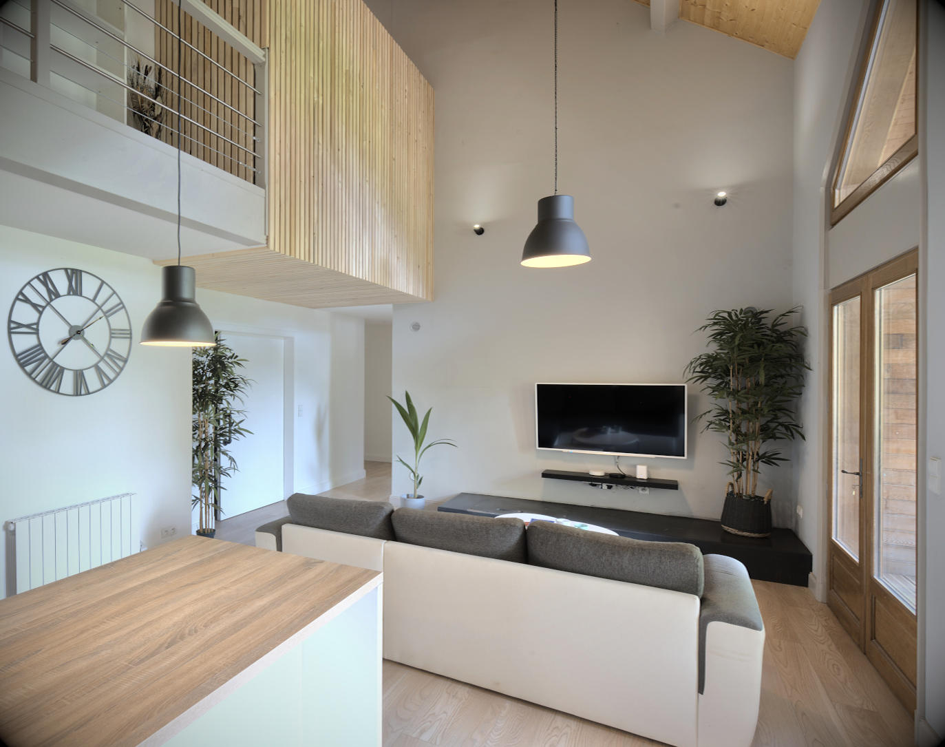 Ce salon cathédral moderne mêle élégamment modernité et nature. Son espace lumineux et aéré, aux murs blancs et sol en ardoise, est dominé par une hauteur sous plafond impressionnante et un mur végétal luxuriant. La cheminée contemporaine en acier noir, les confortables fauteuils en rotin et les détails décoratifs minimalistes accentuent le thème zen. Une terrasse en bois s'étend au-delà, offrant une vue imprenable.